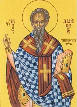 Τῆς σοφίας σε μύστην, ἱερὸν ἐπιστάμεθα, πάντες οἱ ταῖς θείαις σοῦ βίβλοις, ἐντρυφῶντες Δωρόθεε· ποιμάνας ἐκλογάδα γὰρ Χριστοῦ, τῆς Τύρου ἐν συνέσει σου πολλῇ, ἐβεβαίωσας τὸ φίλτρον σου πρὸς Αὐτόν, ἐν πόνοις σῆς ἀθλήσεως. Χαίροις Ἀρχιερέων καλλονή, χαίροις Μαρτύρων καύχημα· χαίροις ὁ φιλοπόνῳ σοῦ σπουδῇ, τὰ θείᾳ συγγραψάμενος.