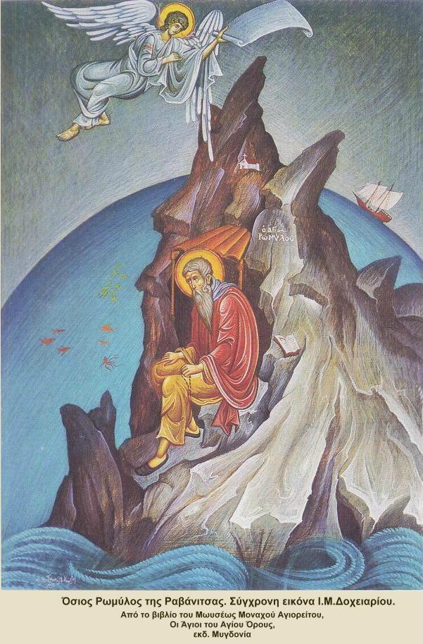 Αργότερα με την ευλογία του Ιλαρίωνος αποσύρθηκε σε τέλεια μόνωση, για να εντρυφά απερίσπαστος στις θείες θεωρίες. Αφού έζησε πολλά χρόνια κατ' αυτόν τον τρόπο, εκάρη μεγαλόσχημος με το όνομα Ρωμύλος. Οι Τούρκοι όμως σε επιδρομές τους κατέστρεψαν το μοναστήρι, και ο όσιος Ρωμύλος με τον μαθητή του Γρηγόριο κατέφυγαν στο Άγιον Όρος, όπου εγκαταστάθηκαν στα Μελανά, κοντά στην Μεγίστη Λαύρα. Οι αγιορείτες μοναχοί σύντομα αναγνώρισαν τις αρετές του και τον επισκέπτονταν χάριν ψυχικής ωφελείας. Διέκοπταν όμως την αγαπημένη του ησυχία, και αναγκάσθηκε να αναχωρήσει σε απομονωμένο κελλί, στους πρόποδες του Άθωνος.