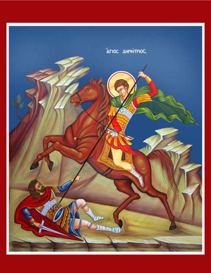 Τοῖς τῶv αἱμάτων σου ῥείθροις Δημήτριε, τὴv Ἐκκλησίαν Θεὸς ἐπορφύρωσεv, ὁ δούς σοι τὸ κράτος ἀήττητοv, καὶ περιέπωv τὴν πόλιv σου ἄτρωτοv· αὐτῆς γὰρ ὑπάρχεις τὸ στήριγμα.