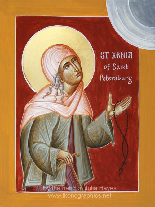 Μερικές φορές, όταν οι Χριστιανοί κάνουν καλές πράξεις, τις κάνουν κρυφά ώστε μόνο ο Θεός να βλέπει. Αυτό γιατί ο Κύριος είπε : «Μην αφήνεις να γνωρίζει η αριστερά σου χείρ τί ποιεί η δεξιά σου» και, «Κάνε τις καλές σου πράξεις μυστικά ώστε ο Πατέρας που σε βλέπει μυστικά να σε ανταμείψει φανερά». Αυτό είναι που αντιπροσωπεύει την εικόνας της Αγίας Ξένιας. Πριν πολλά χρόνια, όταν οι άνθρωποι της Αγίας Πετρούπολης έχτιζαν μια εκκλησία στο κοιμητήριό του Smolensk, η Αγία Ξένια συνήθιζε να πηγαίνει κατευθείαν το βράδυ και να κουβαλάει βαριούς πλίνθους οι οποίοι χρειάζονταν την επόμενη μέρα για το χτίσιμο της στέγης της εκκλησίας. Όταν οι τεχνίτες έρχονταν κάθε πρωί, έβρισκαν το σκληρότερο μέρος της δουλειάς τους ήδη τελειωμένο και αυτοί αναρωτιόνταν ποιός να ήταν που έκανε αυτή την ευγενική πράξη. Τελικά, δυο απ αυτούς αποφάσισαν να περάσουν το βράδυ τους στο κοιμητήριο. Περίμεναν και περίμεναν, και όταν έγινε σκοτάδι, η Αγία Ξένια εμφανίστηκε. Όλο το βράδυ, την παρακολουθούσαν να ανεβαίνει και να κατεβαίνει με τα τούβλα της, τους τοίχους της μισοτελειωμένης εκκλησίας.