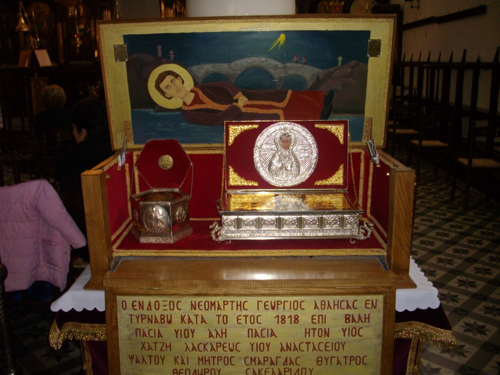 «Ο ΕΝΔΟΞΟΣ ΝΕΟΜΑΡΤΥΣ ΓΕΩΡΓΙΟΣ ΑΘΛΗΣΑΣ ΕΝ ΤΥΡΝΑΒΩ ΚΑΤΑ ΤΟ ΕΤΟΣ 1818 ΕΠΙ ΒΑΛΗ ΠΑΣΙΑ ΥΙΟΥ ΑΛΗ ΠΑΣΙΑ ΗΤΟΝ ΥΙΟΣ ΧΑΤΖΗ ΛΑΣΚΑΡΕΩΣ ΥΙΟΥ ΑΝΑΣΤΑΣΕΙΟΥ ΨΑΛΤΟΥ ΚΑΙ ΜΗΤΡΟΣ ΣΜΑΡΑΓΔΑΣ ΘΥΓΑΤΡΟΣ ΘΕΟΔΩΡΟΥ ΣΑΚΕΛΛΑΡΙΔΟΥ».