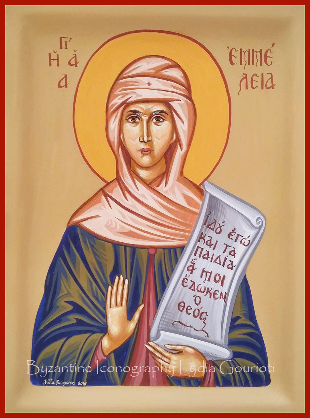 Σωφρόνως τὸν βίον σου κατ' ἐναντίον Θεοῦ, ἐτέλεσας πρότερον σὺν Βασιλείω σεμνῶ, Ἐμμέλεια πάνσεμνε, εἴτα δὲ ἐν ἐρήμῳ, ἀναβάσεις διέθου ἅμα τοὶς σοὶς ἐκγόνοις, ὡς τὰ ἄνω ποθοῦσα, διὸ σὲ ὁ Χριστὸς πανοικοί, ὑπερεδόξασε.