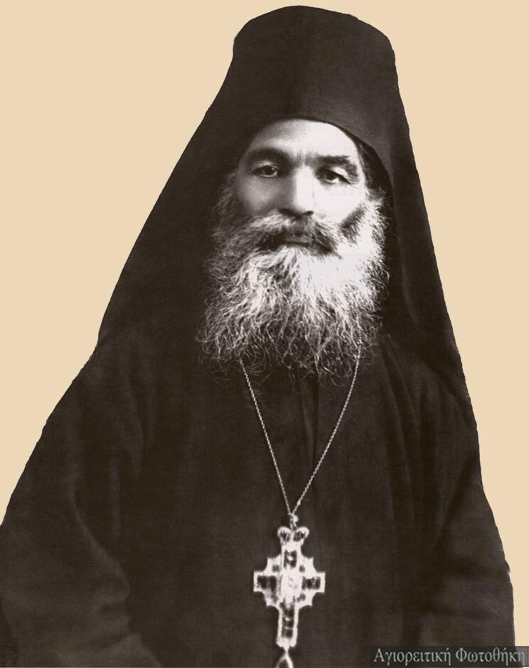 «Ο Γέροντας ήταν πολύ απλός. Κοντός στο ανάστημα. Παρά τ’ ότι ήταν λίγο ευτραφής φαινόταν εξαϋλωμένος και το βλέμμα σου τον διαπερνούσε. Το πρόσωπό του ήταν συνήθως φωτεινό και αυστηρό, σοβαρό και με καλωσύνη. Ποτέ δεν αποχωριζόταν τον καλογερικό του σκούφο. Οι αχνές ρυτίδες του προσώπου του είχαν μια φυσικότητα. Τα μάτια του βαθουλωτά, κοιτούσαν συνήθως χαμηλά και είχαν σπάνια φωτεινότητα. Δυσκολευόσουν αρκετά να τον δεις κατάματα. Συχνά φορούσε απλά ματογυάλια. Το βλέμμα του είχε επιείκεια, ζεστασιά και σε πρόσεχε με μια ακριβή αγάπη. Το χαμόγελό του είχε μια ιδιαίτερη ωραιότητα. Τα γένια του άσπρα, και στην μέση χωρίζανε λίγο. Συνήθως ήταν ωχρός. Ένας απλός ιερομόναχος, με καθαρά ρούχα και υποδήματα. Με έντονα τα ιδιαίτερα πατρικά χαρίσματα, αγαθότητα, ηρεμία, διάκριση και συμπάθεια. Ο χαρακτήρας του προσώπου του γενικά, υπογραμμισμένος από την λευκότητα των διάχυτων μαλλιών του, η απλότητα των ενδυμάτων και των λόγων του, η χάρη των νοημάτων του από θερμές φράσεις γίνονταν βιβλίο βοηθείας στους αναγκεμένους. «Στολισμός γάρ ανδρός και βήμα ποδός και γέλως οδόντων αναγγελεί τα περί αυτού». Βλέποντάς τον να ζει μέσα σε μια συνεχόμενη και αδιατάρακτη πραότητα και γαλήνη, αυτόν τον άνθρωπο του Θεού, τον απλό γέροντα, αναφωνούσες στα μύχια σου· «Καλόν το πορεύεσθαι οπίσω Κυρίου…».