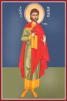 Τοῦ σταυροῦ τῇ δυνάμει καθοπλισθείς, ἀπειλὰς τῶν βαρβάρων μὴ πτοηθείς, προθύμως διήνυσας, τὸν ἀγῶνα μακάριε‧ εὐτολμίᾳ ἐλέγξας αὐτῶν τὴν δυσέβειαν, καὶ σοφῶς ἐκδιδάξας τοῦ λόγου τὴν σάρκωσιν‧ ὅθεν τοὺς στεφάνους, παρ’ αὐτοῦ ἐκομίσω, ἀξίους τῶν πόνων σου καὶ ἱδρώτων σου Ἅγιε, Ὁσιομάρτυς Νικόλαε‧ πρέσβευε Χριστῷ τῷ Θεῷ, τῶν πταισμάτων ἄφεσιν δωρήσασθαι, τοῖς ἑορτάζουσι πόθῳ τὴν ἁγίαν μνήμην σου.
