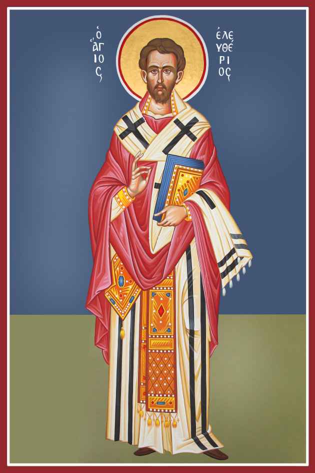 Ἐλεύθερον τὸν νοῦν, ἐκ παθῶν κεκτημένος, ἐγένου τοῦ Θεοῦ, γνησιώτατος δοῦλος, καὶ πλάνης ἠλευθέρωσας, τοὺς καλῶς σοι ποθήσαντας, ἐναθλήσας δέ, ὡς ἱερεύς τε καὶ Μάρτυς, Ἐλευθέριε, διπλοῦν ἐδέξω τὸ στέφος, πρεσβεύων σωθῆναι ἡμᾶς.